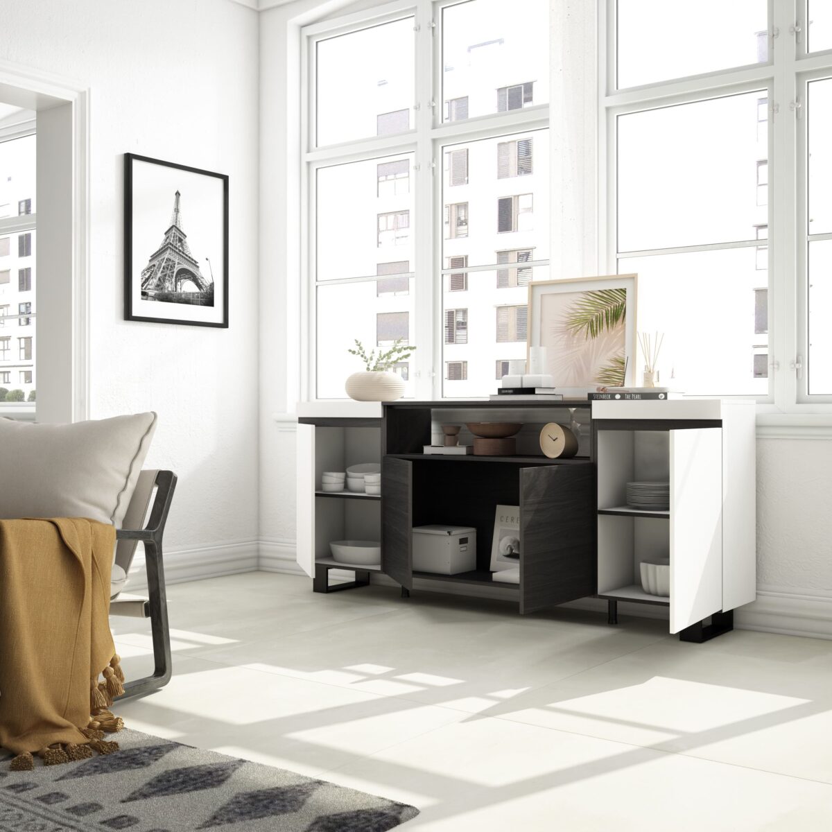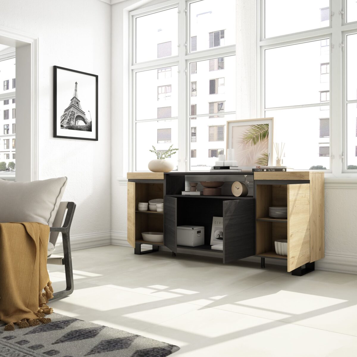 Un aparador de diseño industrial moderno que aporta personalidad y orden a tu hogar.