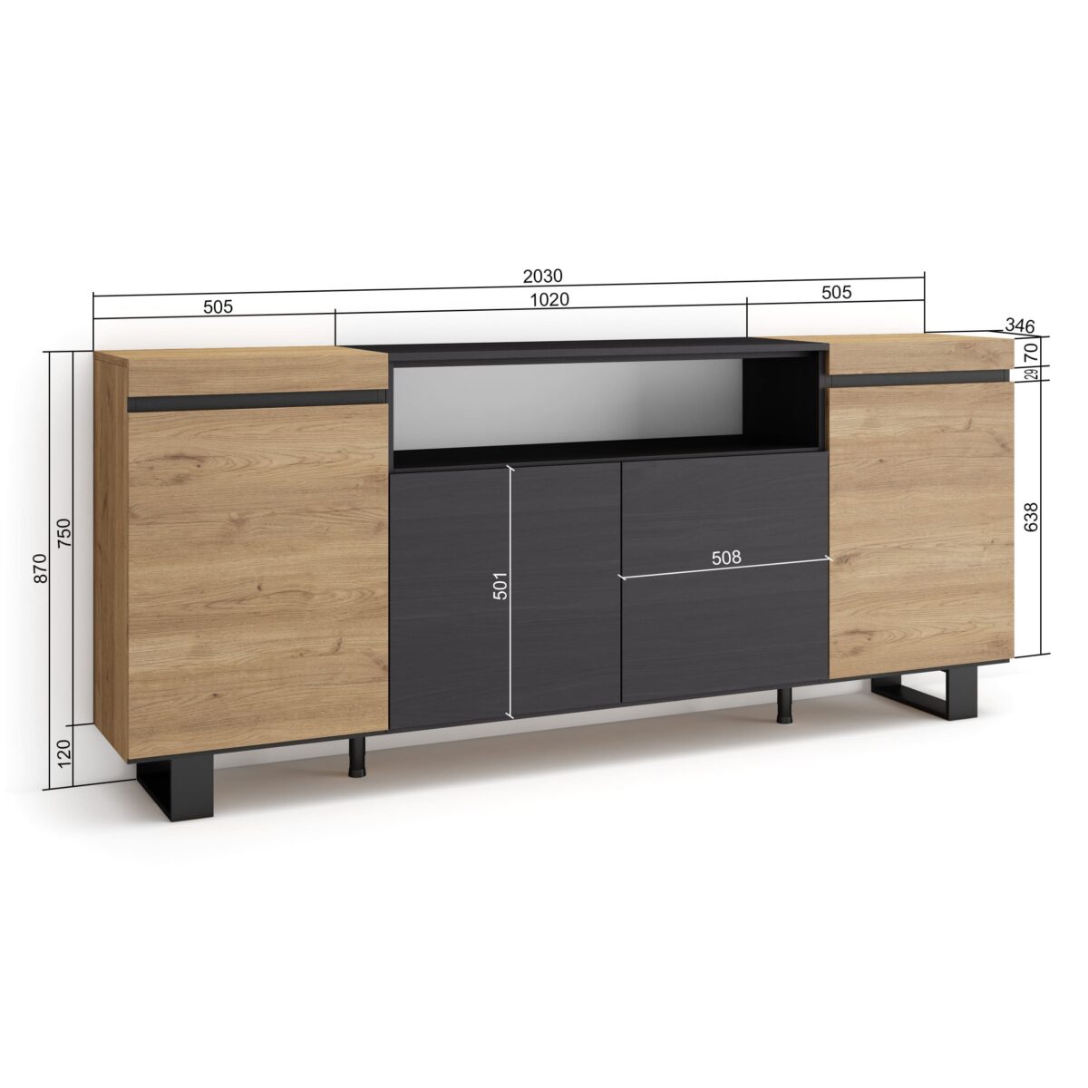 Con sus 4 puertas de amplio almacenaje, tendrás espacio suficiente para mantener tu vajilla, mantelería, libros o accesorios bien organizados, siempre a mano y con un toque de distinción. Su diseño combina la calidez de la madera con el carácter del metal, creando un equilibrio único entre lo industrial y lo moderno, perfecto para destacar en cualquier ambiente.