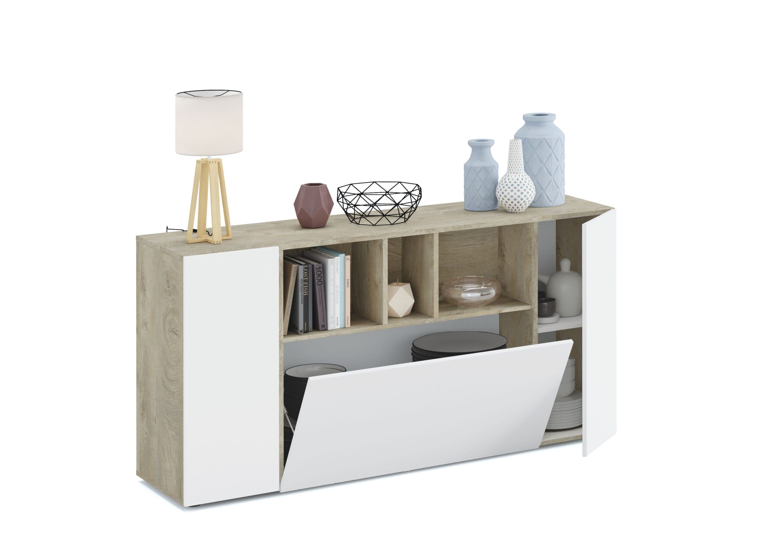 Además de su alta capacidad de almacenaje, te proporcionará un espacio lleno de bienestar y modernidad, ya que su precioso diseño con 3 puertas Blanco Artik y los estantes y huecos Roble Alaska le da un toque muy moderno al recibidor. El aparador es de color Blanco Artik y Roble Alaska, lo que hace que el mueble sea completamente moderno y de un toque de diseño a tu espacio.