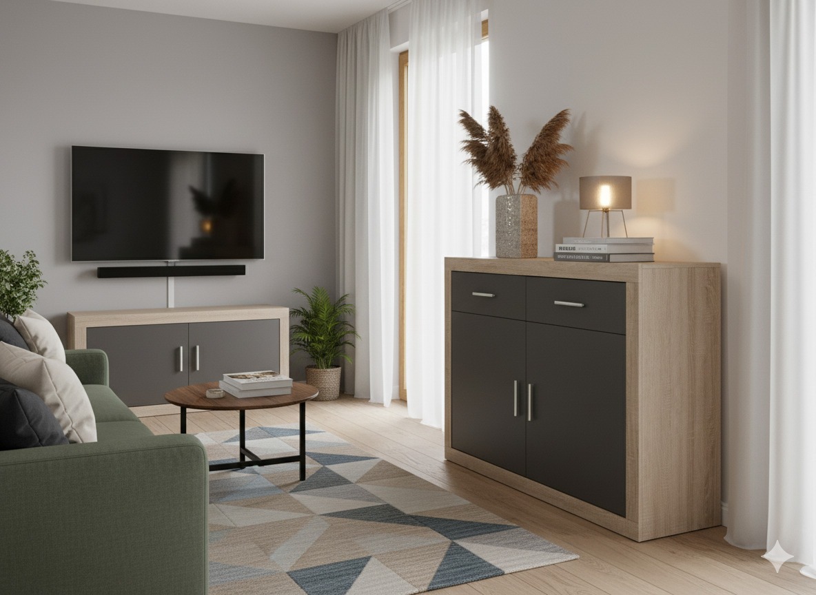 El Aparador Lara Cambria-Grafito cuenta con una bonita estructura enmarcada en color Cambria combinado con grafito para las puertas y cajones. Dispone de dos cajones y dos puertas para aumentar la capacidad de almacenaje de tu salón.