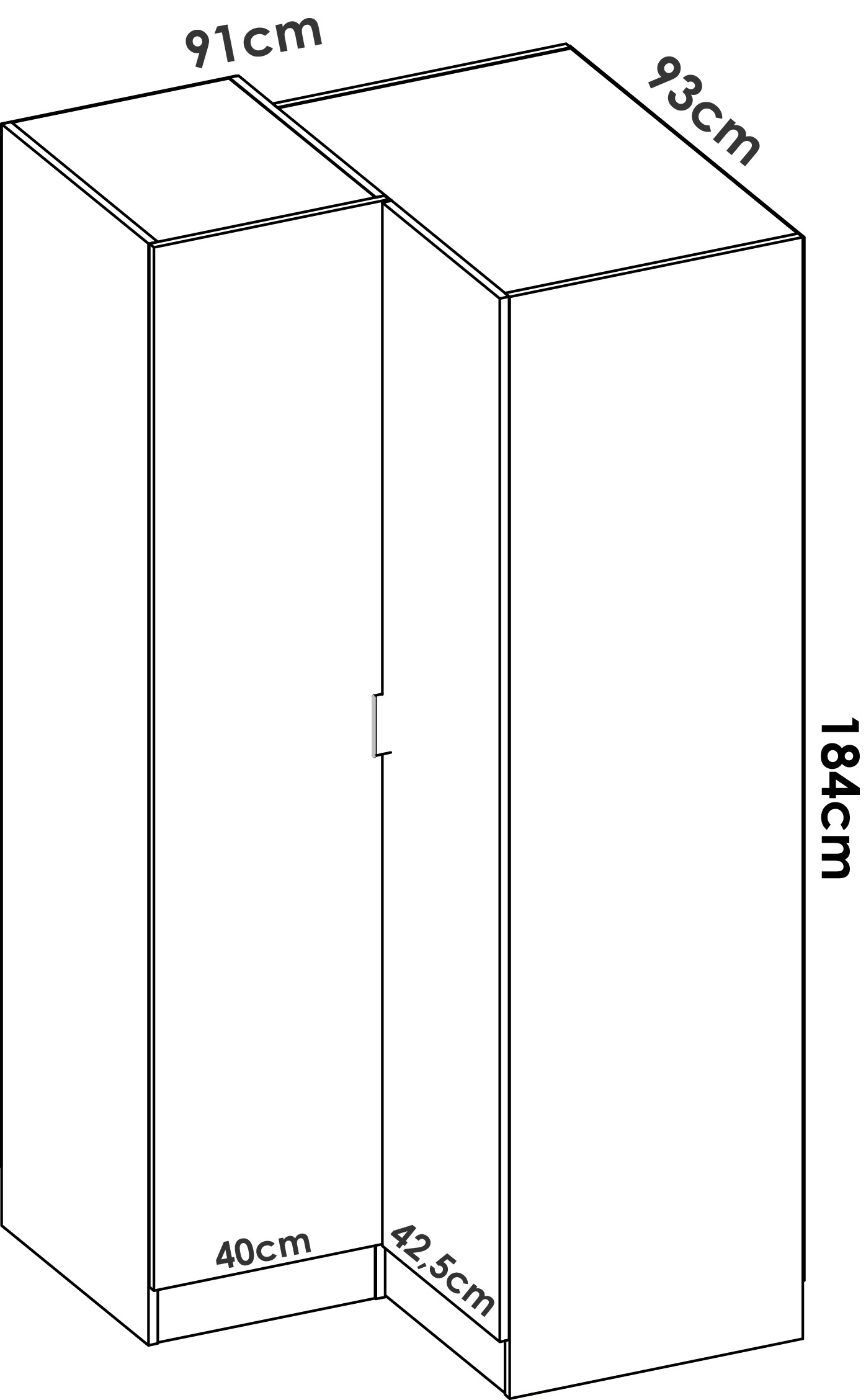 Descubre el Armario Rincón con Puertas Essen: un mueble diseñado especialmente para adaptarse a cualquier rincón de tu dormitorio y maximizar el espacio disponible. Con unas dimensiones de 184 cm de alto, 90,5 cm de ancho y 92,5 cm de fondo, este armario se convierte en la solución perfecta para aprovechar cada centímetro de tu hogar.