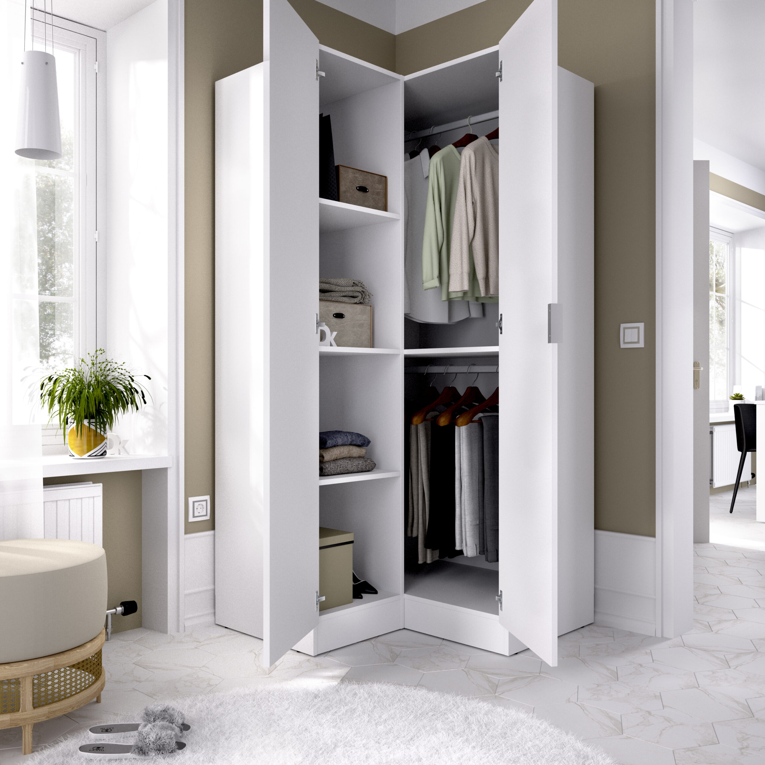 El Armario Rincón con Puertas Essen presenta un estilo moderno e innovador gracias a su forma única y sus líneas depuradas. Fabricado en madera manufacturada resistente y con un acabado lacado en blanco, este armario aporta un toque de frescura y luminosidad a tu espacio, además de garantizar durabilidad y resistencia a lo largo del tiempo.