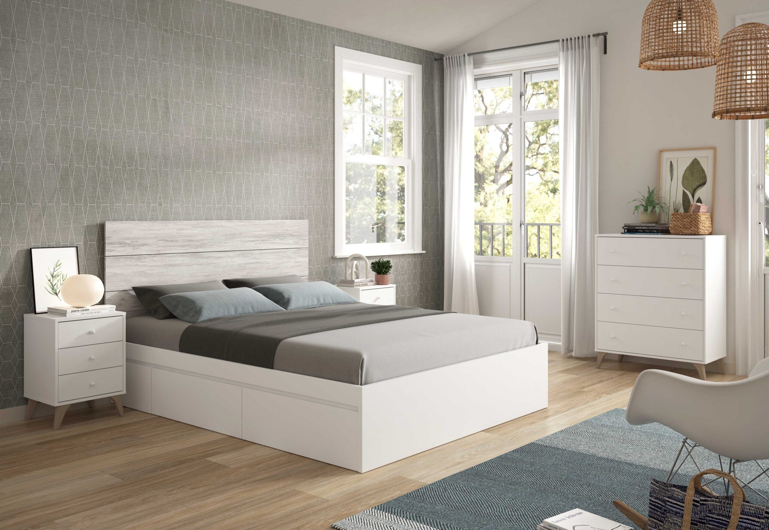Además de su alta capacidad de almacenaje, te proporcionará un espacio lleno de bienestar y modernidad, por el hecho de que su precioso diseño liso del cabezal y las mesitas le da un toque muy moderno al dormitorio, ya sea el principal o juvenil. El cabezal es de color Blanco Velho, y las mesitas son de color Blanco Artik, lo que hace que los muebles sean completamente modernos y den un toque de diseño a tu espacio.
