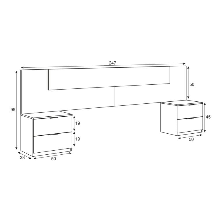 - Cabezal: 50 cm (alto) x 247 cm (ancho) x 3 cm (prof.)