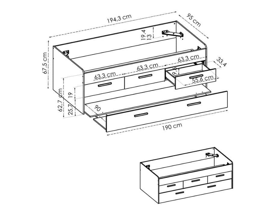 La parte superior de la cama cuenta con espacio para un colchón de 90 x 190 cm (no incluido), garantizando el descanso de tus hijos. En la parte inferior, encontrarás un práctico cajón extraíble que al extenderlo, tiene capacidad para un colchón adicional de 90 x 190 cm (no incluido), convirtiéndose así en una cama nido ideal para visitas o para compartir habitación. Además, sobre este cajón se ubican tres cajones perfectos para almacenar ropa de cama, juguetes o cualquier otro objeto, permitiendo mantener el orden y la organización en la estancia.