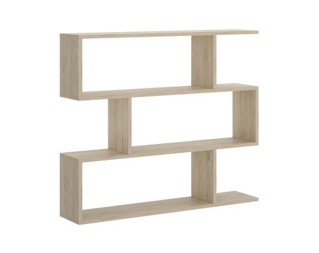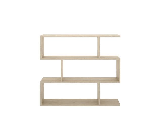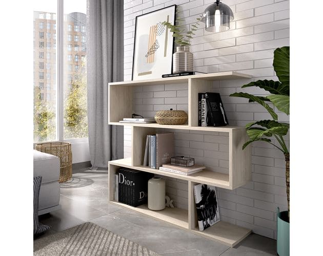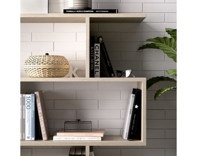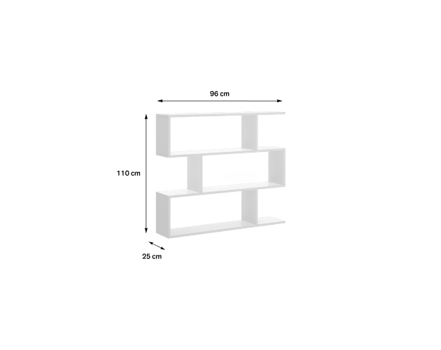 Con sus 96 cm de alto, 110 cm de ancho y 25 cm de fondo, esta estantería ofrece espacio suficiente para libros, adornos, marcos, plantas o velas decorativas. Su estructura asimétrica le da un aspecto contemporáneo que atraerá todas las miradas, aportando dinamismo y equilibrio visual a tu estancia.
