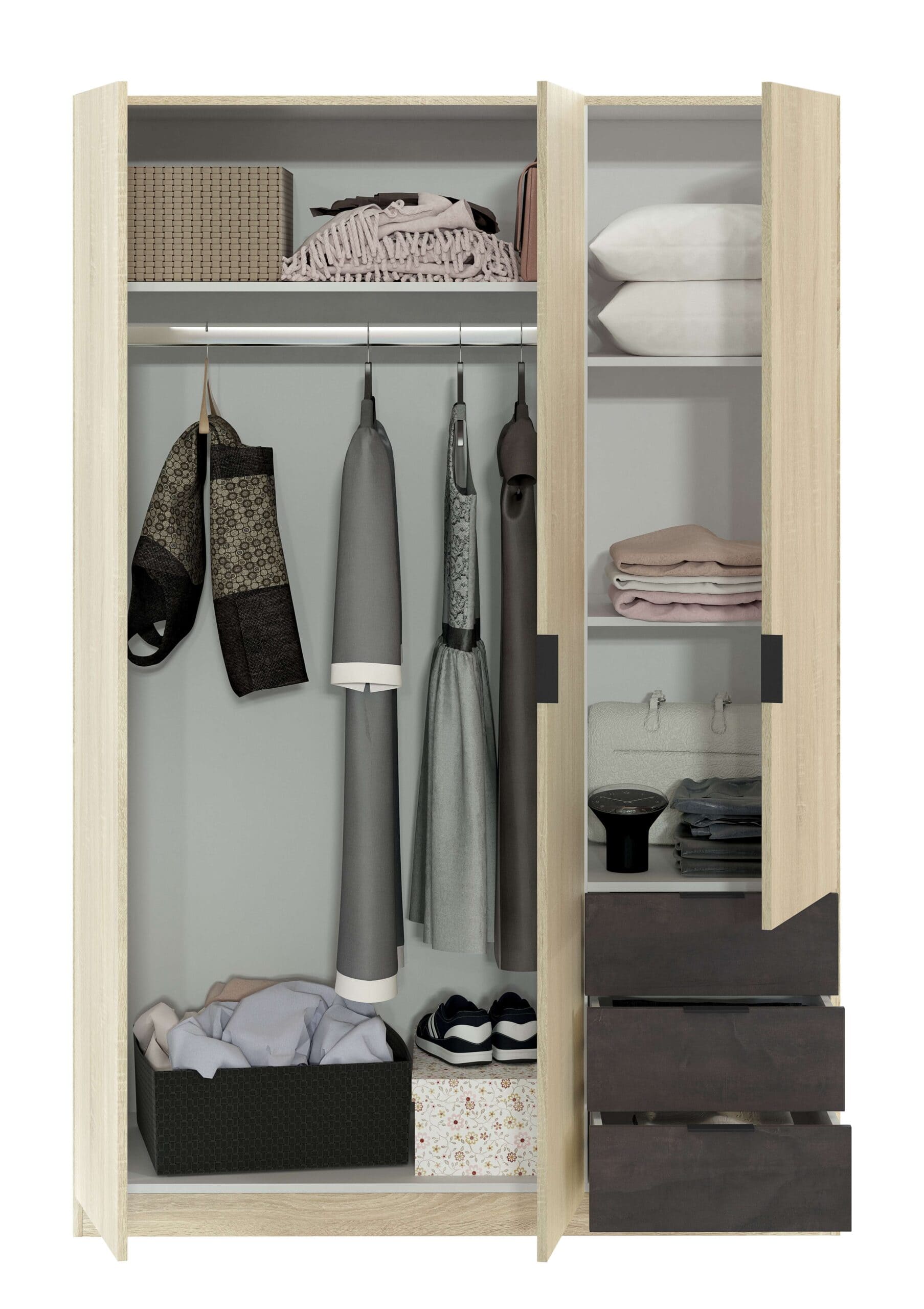 Incluye mueble desmontado compuesto por armario 3 puertas y 3 cajones en colores roble canadian y oxido