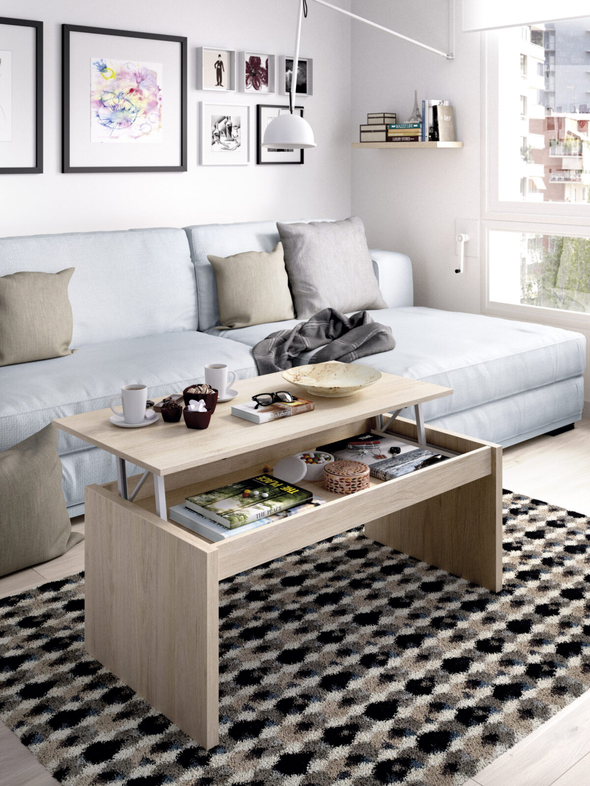 Es una mesa auxiliar que quedará perfecta en cualquier salón. Cerrada es útil como cualquier mesita de centro, pero abierta, nos acerca la encimera hasta una altura muy cómoda para poder trabajar desde el sofá con el portátil e incluso comer viendo la TV, ¿necesitas un Mueble TV?.