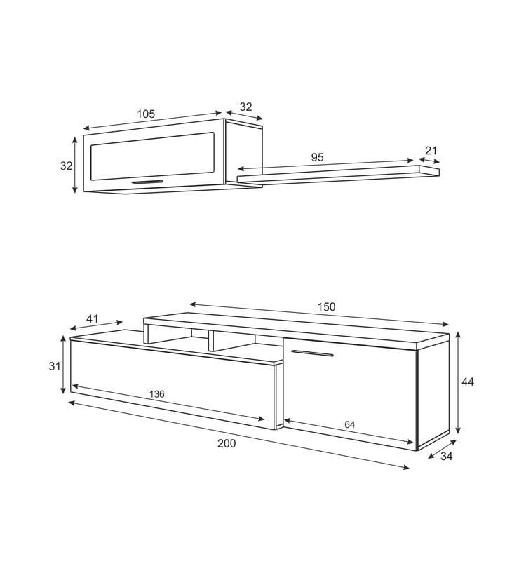 Mueble TV: 44 cm (alto) x 200 cm (ancho) x 41 cm (prof.)