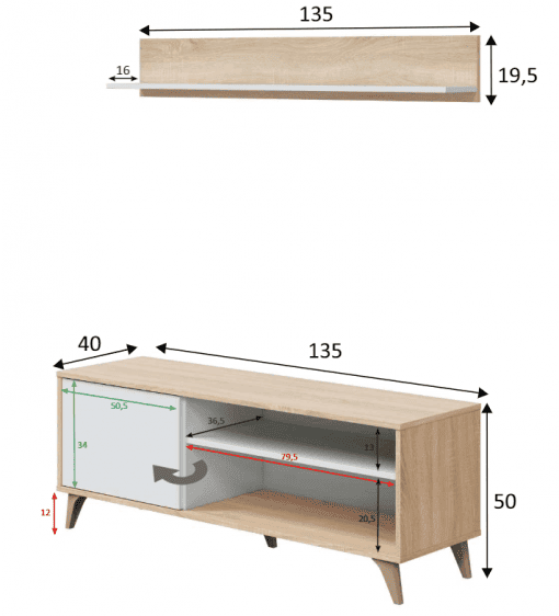 - Mueble TV: 50 cm (alto) x 135 cm (ancho) x 40 cm (prof.)