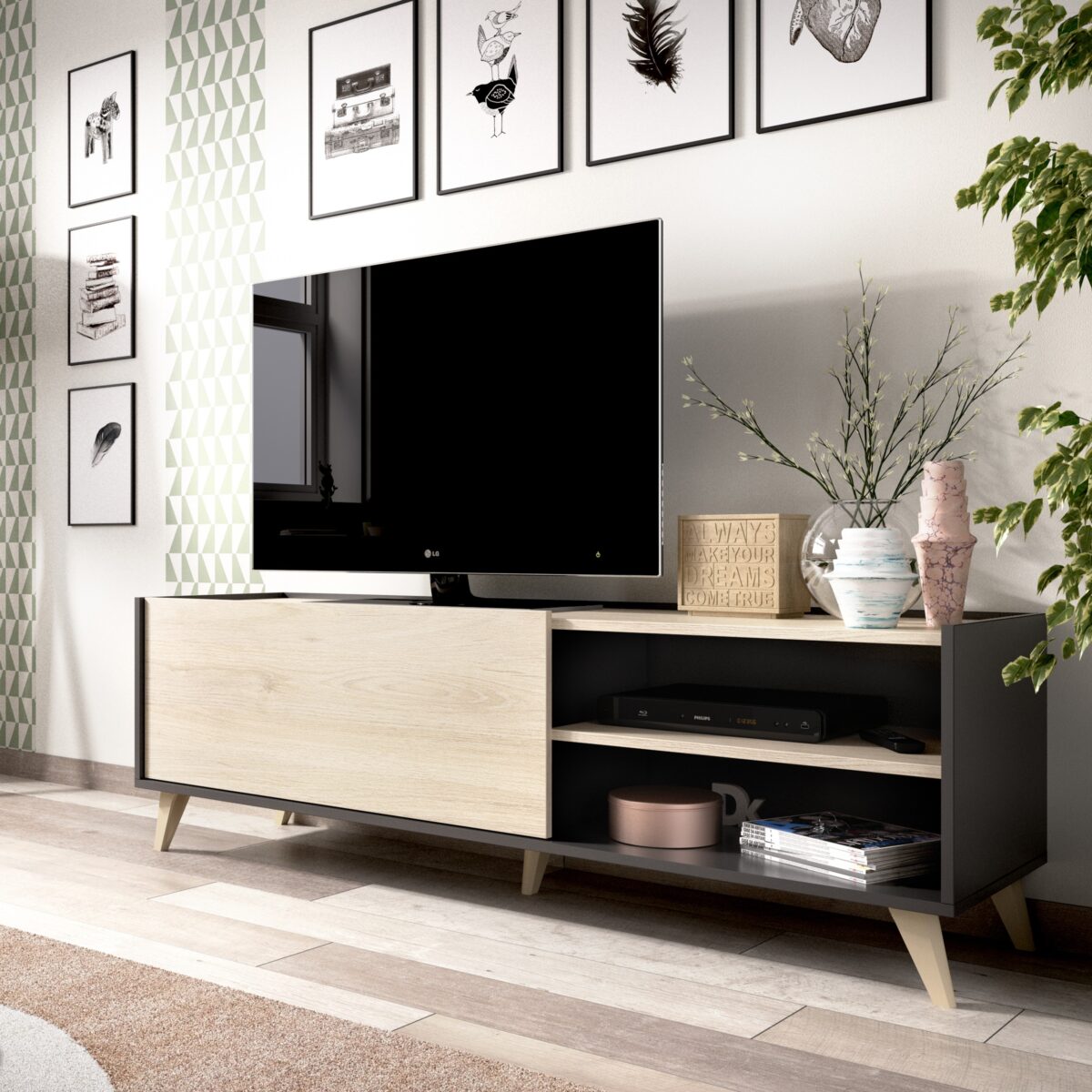 El mueble de TV Ness es moderno y práctico, colores elegantes y modernos que dan un toque distintivo. Es un mueble que cuenta con una puerta que dispone de pistón hidráulico para que no se golpee la puerta y sea más práctica en apertura y cierre. Dentro dispone de un gran hueco para almacenar todo tipo de utensilios, en el lado derecho dos huecos con estante central en color roble natural dejarán tus aparatos electrónicos a mano.