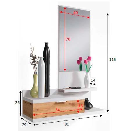 Tenemos la solución, ya que el recibidor con 1 cajón y espejo Lia es perfecto para poder guardar todas tus cosas al entrar y al salir de casa, como por ejemplo la cartera, las llaves del coche y de casa, las gafas de sol, etc. Está pensado para atraer un ambiente de bienestar al recibir invitados o simplemente al llegar de trabajar. Este recibidor dispone de un gran espacio para almacenar tus pertenencias, ya que hace 116 cm de alto y 81 cm de ancho.