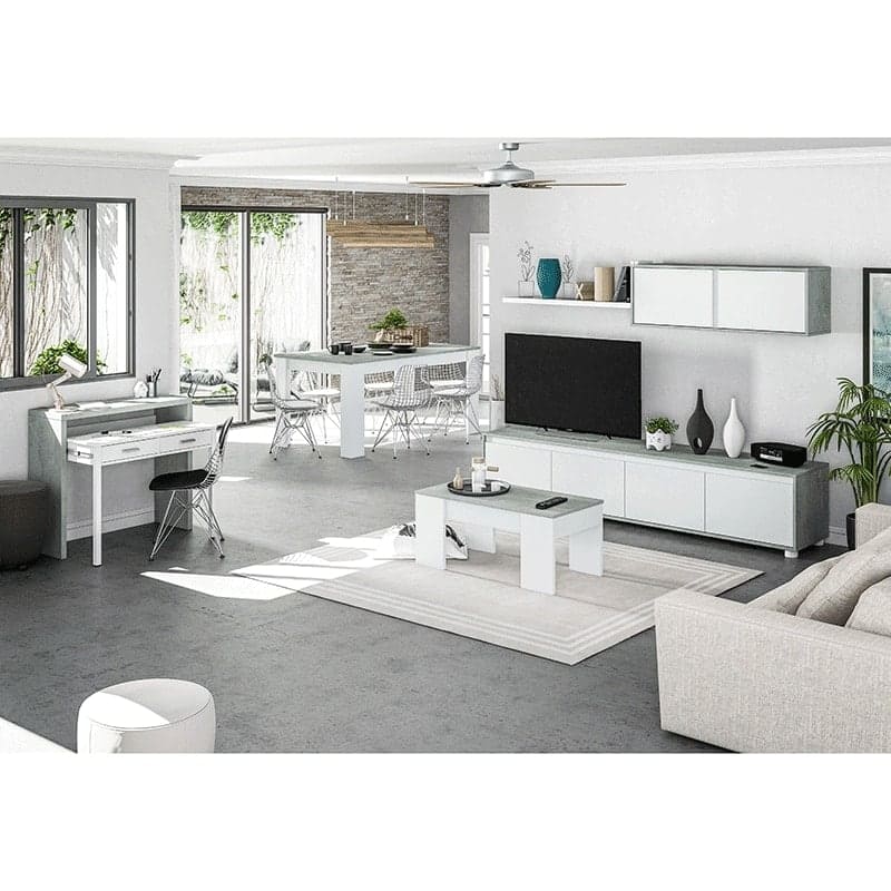 ¿Necesitas remodelar tu salón con un precioso mueble que te sirva tanto para poner la televisión, guardar libros, jarrones, fotografías, etc. para que quede el comedor más ordenado y moderno? Tenemos la solución, ya que el Salón comedor Home Cemento Blanco Artik es perfecto para poder disfrutar de una tarde en tu sofá viendo una película o serie.