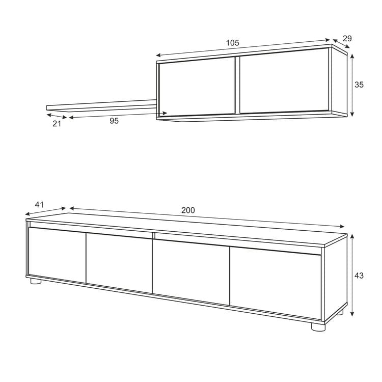 - Mueble TV: 43 cm (alto) x 200 cm (ancho) x 41 cm (prof.)
