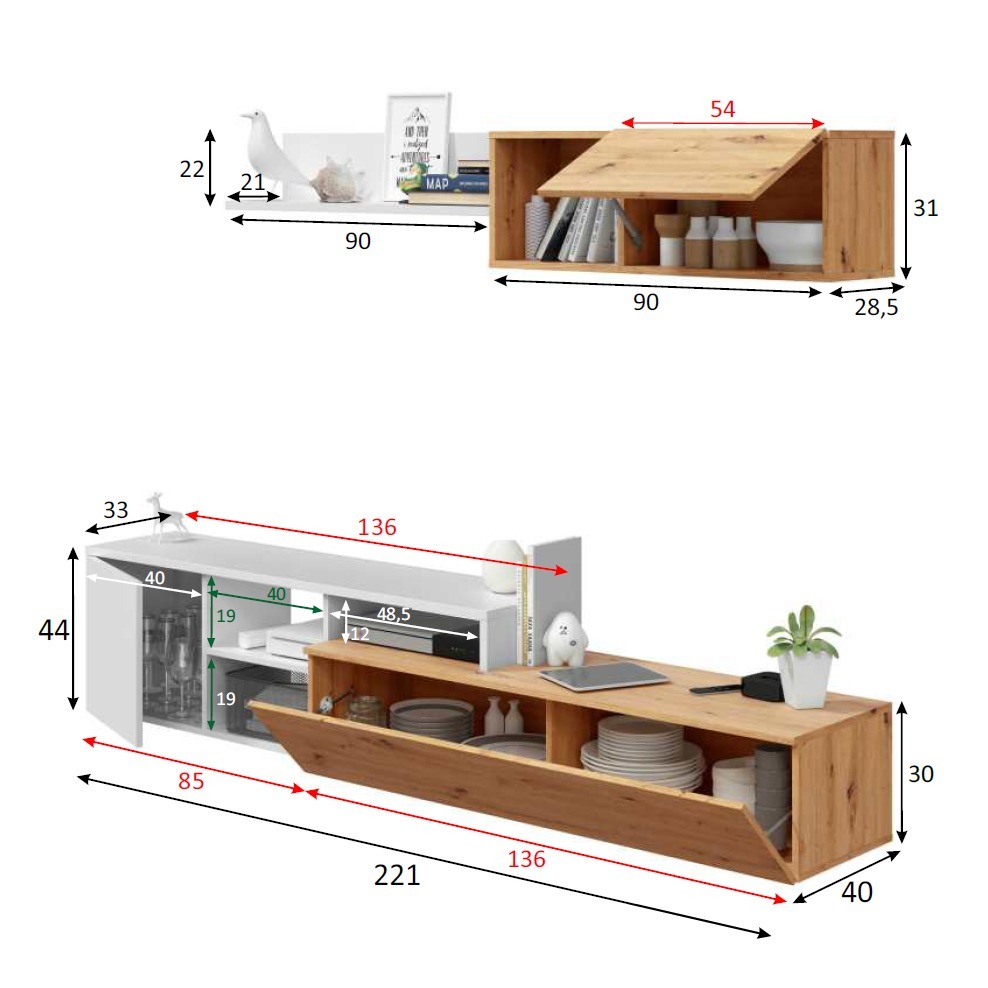 - Mueble TV: ↕ 44 cm ↔ 221 cm ↗ 40 cm