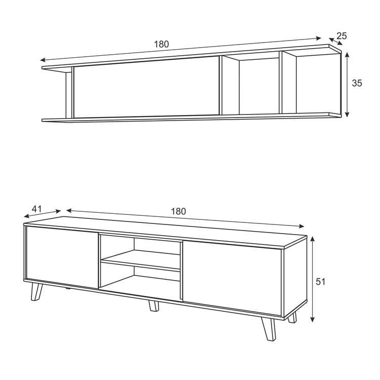 - Módulo superior: 35 cm (alto) x 180 cm (ancho) x 25 cm (prof.)