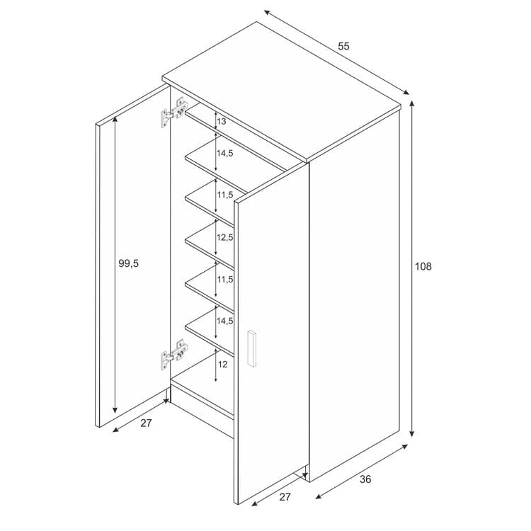 - Dimensiones: 108 cm (alto) x 55 cm (ancho) x 36 cm (prof.)